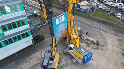 Für die Erweiterung der Hirslanden Klinik Aarau ersetzten unsere Experten der Bauer Spezialtiefbau Schweiz die geplante Spundwand durch eine Mixed-in-Place-Wand (MIP). Die 550 mm starke Wand reicht bis zu 17 m tief und enthält HEB- sowie Doppel-UPE-Träger. Zwei Bereiche wurden mit 2 m breiten Jetting-Säulen gesichert. Aufgrund von Umweltauflagen wird ein Teil der MIP-Wand 2025 im Kellybohrverfahren wieder entfernt. Die Arbeiten starteten im Januar 2024 und wurden termingerecht im Februar abgeschlossen. Zum Einsatz kamen die RTG RG 27 S und RG 19 T für Trägereinbau und Spritzschutz.