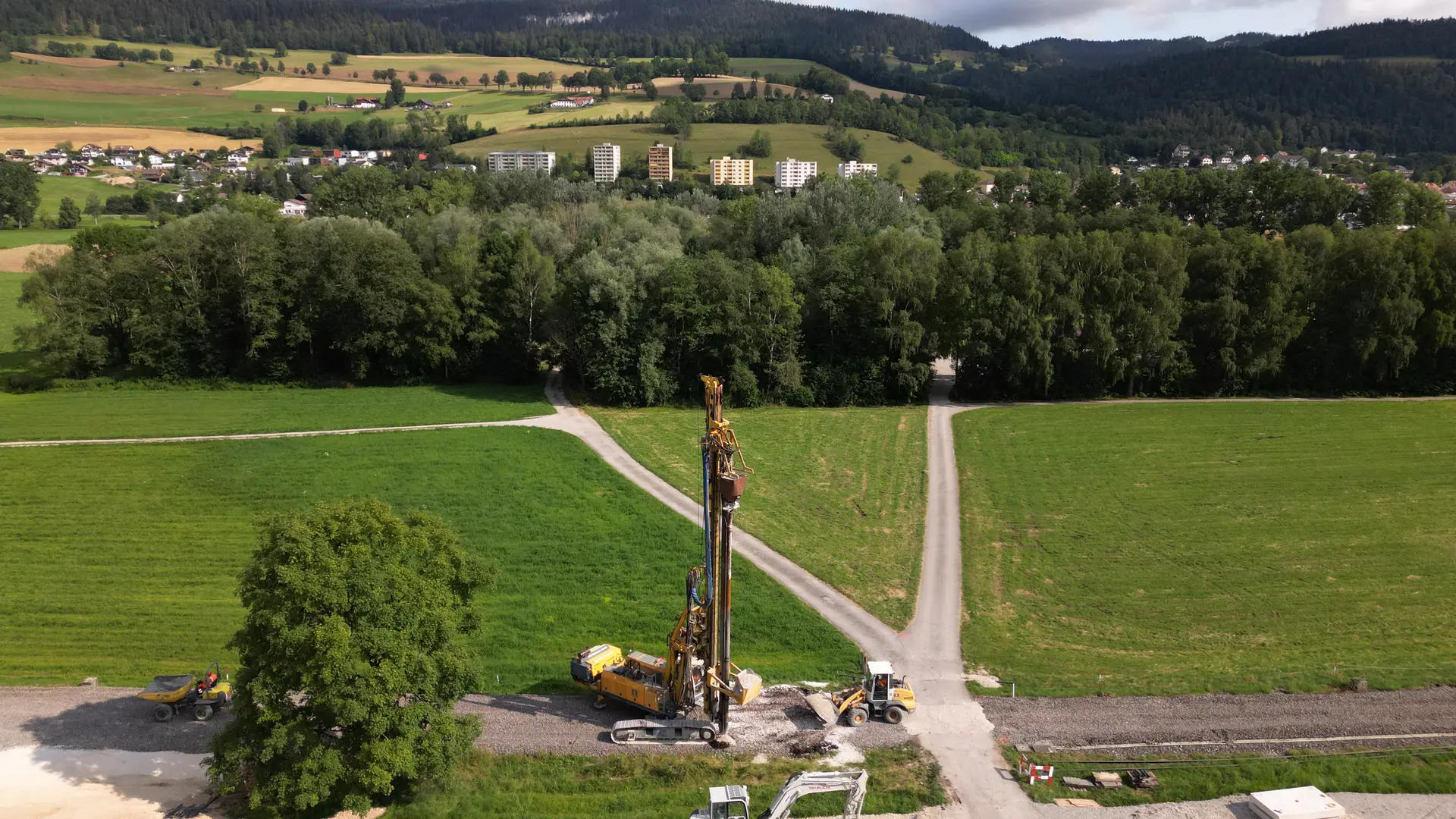 In collaboration with the experts from Bauer Spezialtiefbau Schweiz, the Neuchâtel transport company has completed a challenging track renovation project on the railroad line between Couvet and Môtiers. The unstable position of the overhead line masts and displaced tracks due to the soft ground, consisting of layers of peat up to 3 m thick, required an innovative solution. The load-bearing capacity of the soil was improved with vibrating stone columns (RSV) and precisely installed Kelly piles – a sustainable method that protects the environment in the nature reserve. Thanks to intensive testing and Bauer's expertise, all the work was completed on schedule in October 2024 despite the challenges.